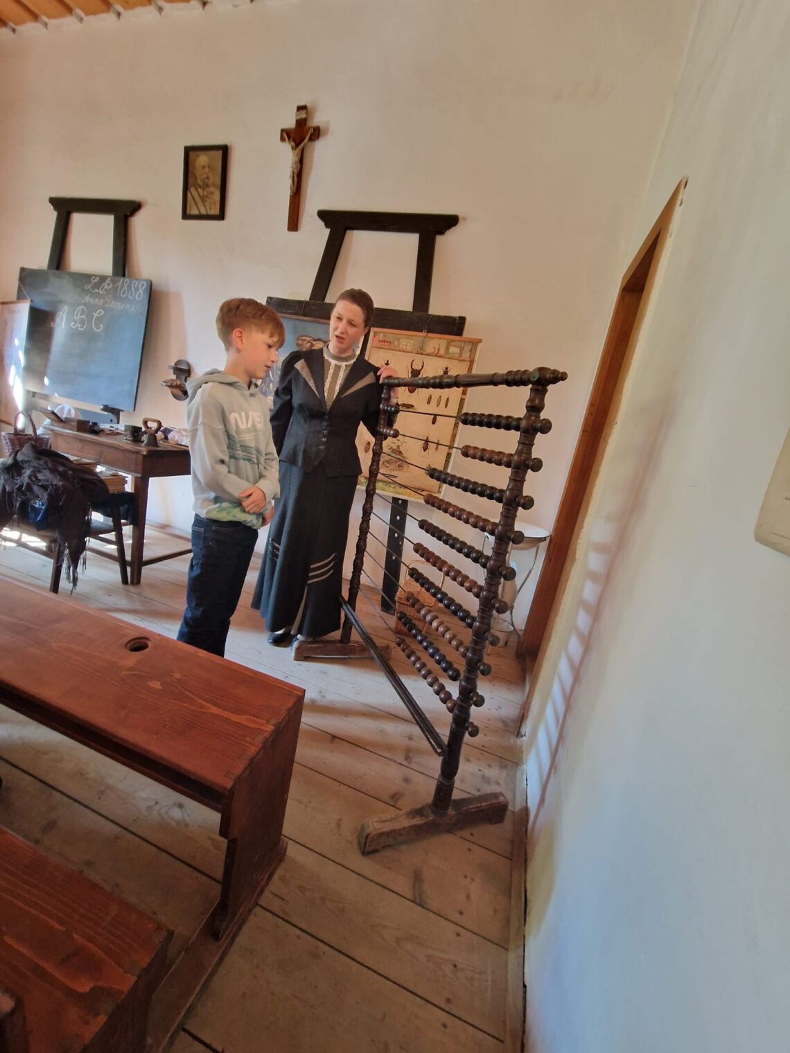 Skočili 100 let zpátky do škamen s kalamářem. Seděli jako pěny a kulili oči, jak jednoduché to kdysi bylo. Slečna učitelka Alena provedla naše děti časem drilu, harmonia, obav a tělesných trestů. Odvážní mohou vstoupit do staré školy ve Skanzenu tudy.