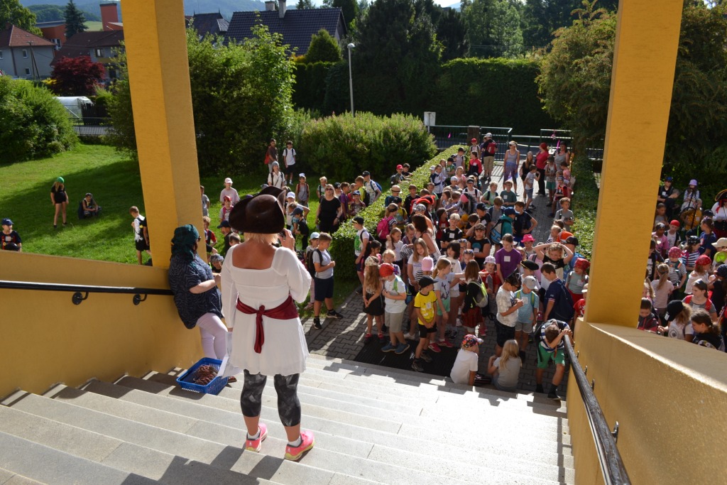 Snídalo se s děravými kapsami a obědvalo už s pokladem. Mezi těmito body se odehrála přátelská utkání rozumu, trpělivosti, přesnosti a rychlosti na místech obsazených přísnými piráty. Ti nikoho nepustili po trase dál bez splnění úkolu. Skládalo se puzzle, trefovaly cíle statické i pohyblivé, učila se báseň, poznávala mořská stvoření, dumalo se, smysly testovaly a dráha opic prolézala a během běhu 🙂 byla ve hře ještě křížovka. Ta nakonec dovedla každou skupinu mořeplavců k pokladu. Nejen k poznání, že spolupráce a klid se vyplácí. Tady přemýšlejí, běhají a žasnou účastníci. Děkujeme mořským vlkům z osmičky a hlavní pirátce S. provoláváme slávu – Huja hou!