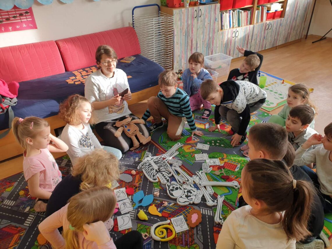 zaslouží obdiv z plných plic. Vysypat ve třídě hromadu kostí na koberec aniž by způsobila paniku, to dokáže Kamila Cermanová, expertka na 1. pomoc. V lehkosti, pečlivě a hravě ukázala prvňáčkům, jak to chodí a běží v našich tělech. Tepající srdce všichni sledovali jako omámení a vzápětí kontrolovali to svoje. Dokázali společně poskládat orgány na pravá místa a nezapomněli ani na jeden obratel. Vrcholem dopoledne byl ledvinový pokus a pár velkých snů o studiu lékařství:). Tělověda je zachycena tady.