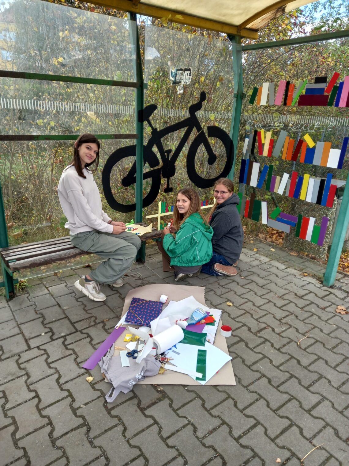 Knihovna, papírnictví, pošta, opravna kol, opravna obuvi a blízkost základní školy – to vše jsou motivy, které se díky výtvarnému úsilí žáků 8.C objevily na zastávce Centrum. Polep v podobě barevných folií zastávku nejen tematicky odlišuje od ostatních zastávek, ale zároveň funguje jako ochrana proti zbytečným úmrtím drobného ptactva. Do práce na polepování zastávky se zapojily nejen žačky 8.C, ale také další kolemjdoucí či na autobus čekající žáci naší školy. Všem patří velké díky! Hana Děcká Doprovodné obrázky najdete zde.