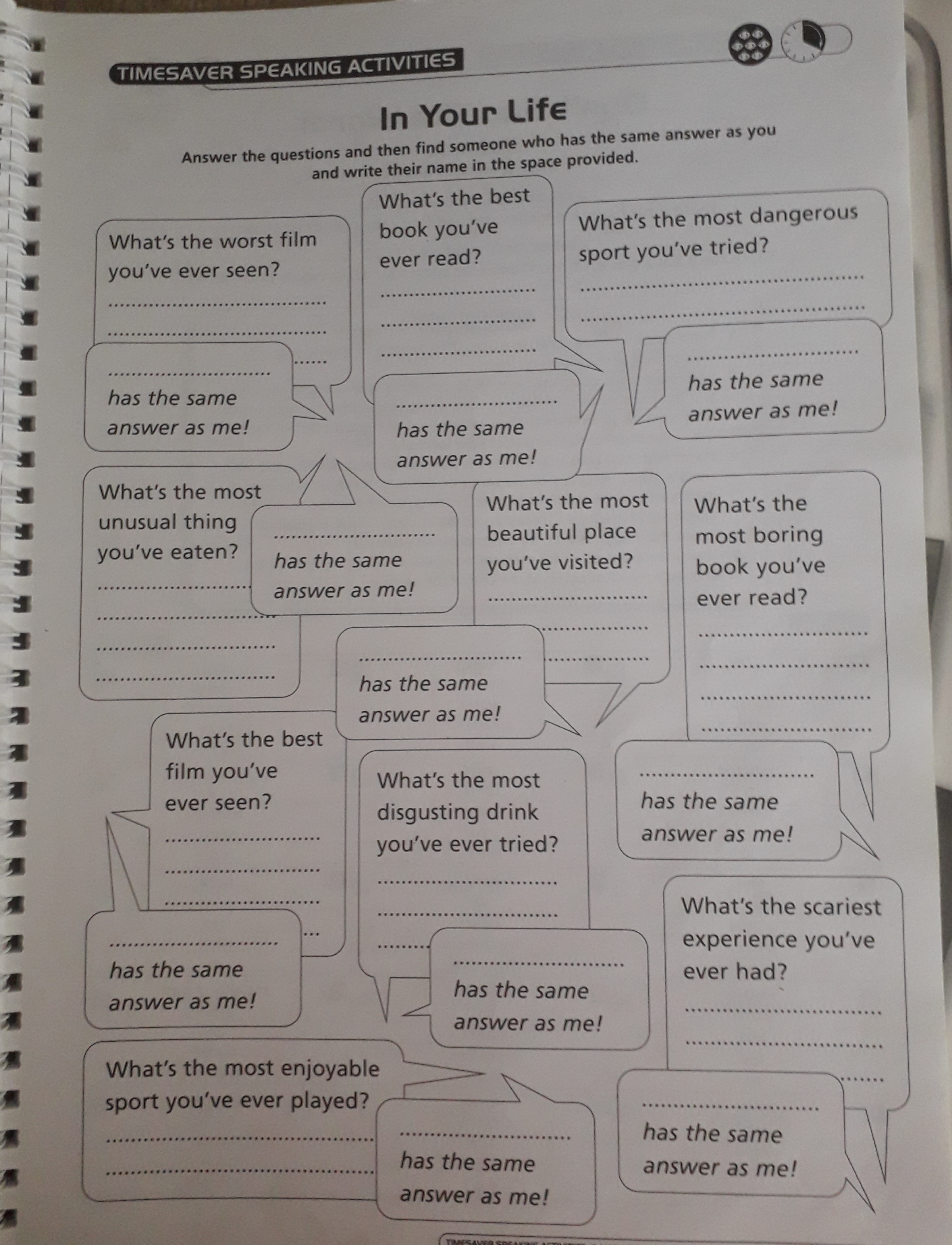 3. Do „Englishe“ si ještě zaznamenejte odpověď na deset otázek z následující ofocené „speaking activity“. Až se uvidíme, můžete se svými odpověďmi zpětně pochlubit. Co se zde procvičuje, je vazba….you´ve ever seen. Znáte ji už z otázek z předchozího cvičení 🙂