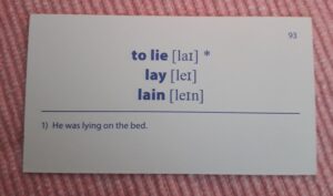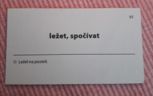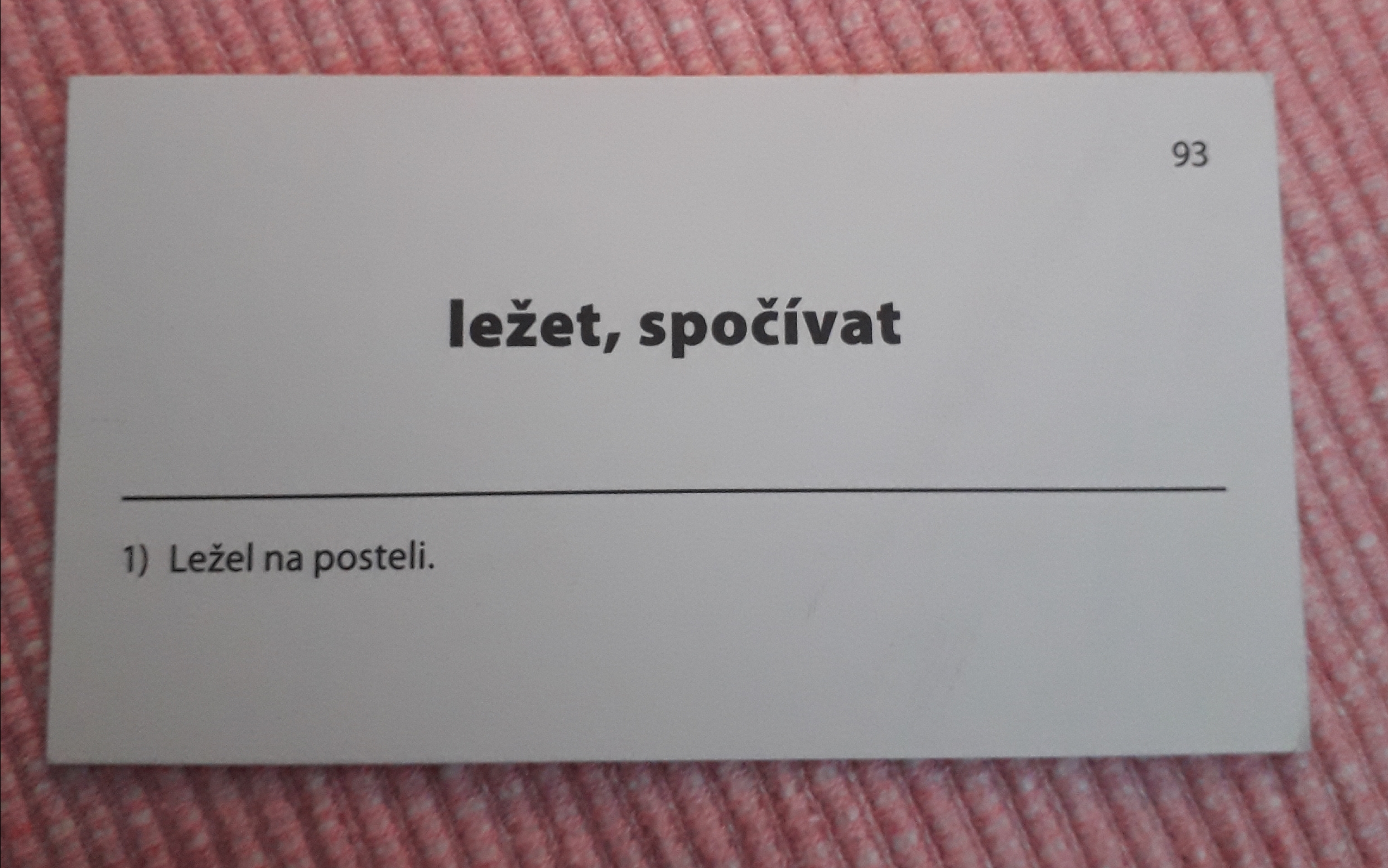 4. Natrénuj další slovesa – třetí tvar – tedy od slovesa sell až po spend. (Pracovní sešit str. 79) Pokud by ti to činilo obtíže, doporučuji si z tvrdšího kartonu udělat kartičky, z jedné strany si napsat jen infinitiv – sloveso v základním tvaru tak, jak ho znáš ze slovíček, a z druhé strany si napsat druhý a pod něj třetí tvar. Takto se to báječně naučíš. (Někdo si na přední stranu poznamená třeba i český překlad.) Přikládám vzor („Memokarty, Angličtina, Nepravidelné tvary“ a naše „hororové sloveso“ 🙂