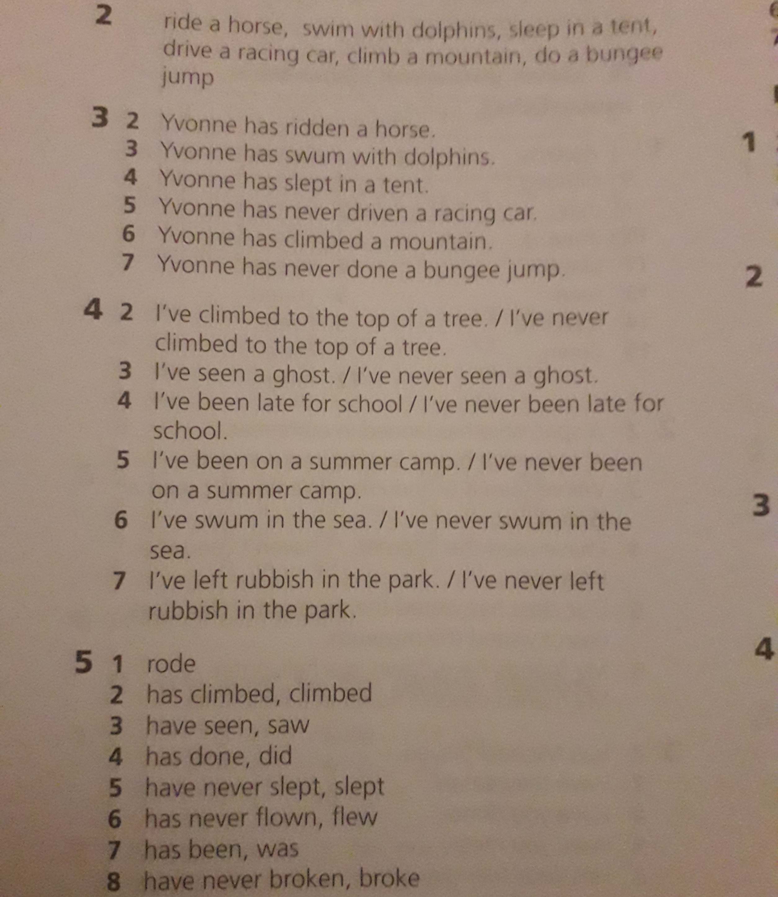- 3 – výrazy z cvičení 2 použijte (podle vzoru) v předpřítomném čase pod správným obrázkem, „fajfka“ v obrázku znamená Yvonne tyto aktivity zažila, „křížek“ – nezažila