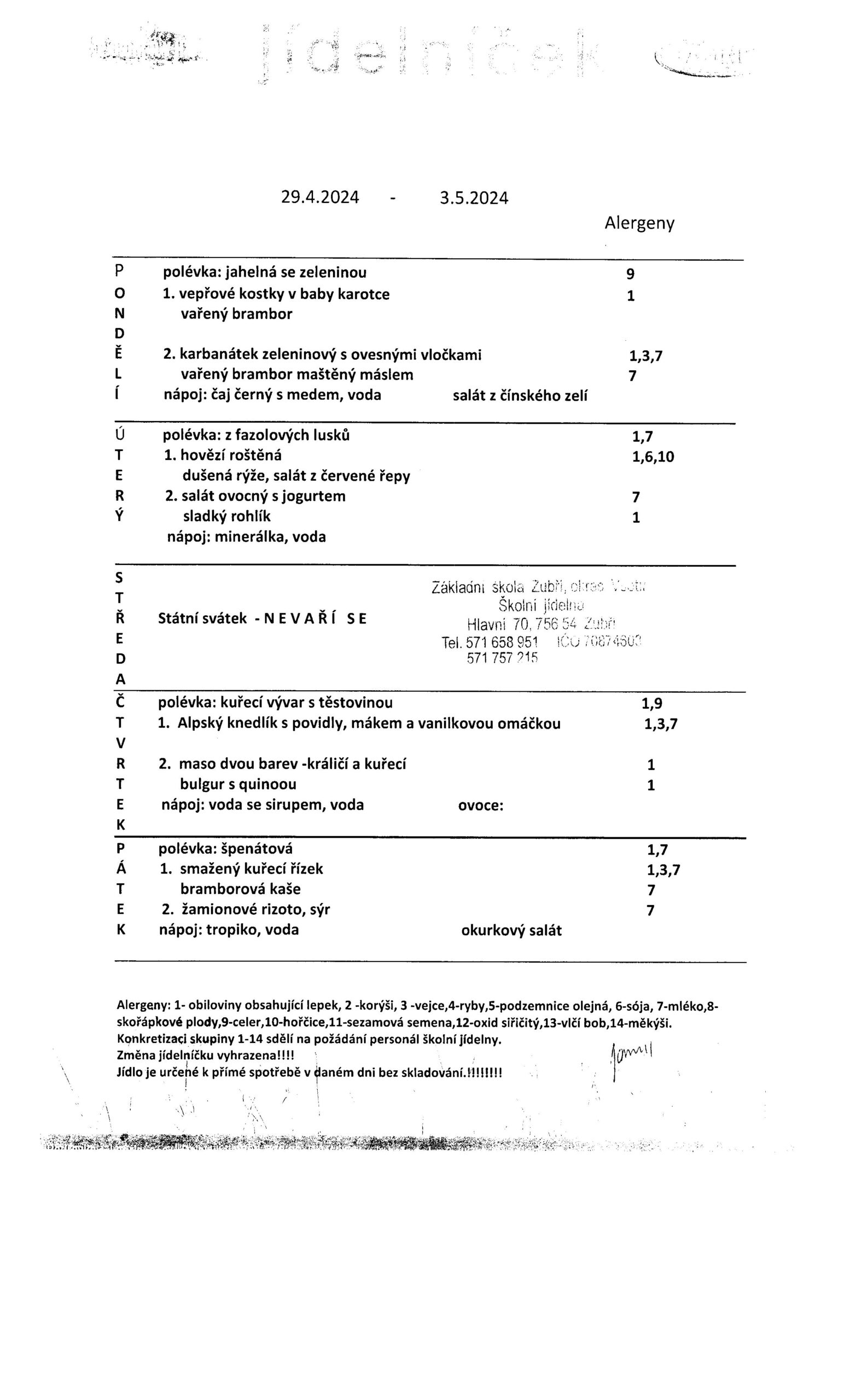 Jídelníček od 29.4.2024-3.5.2024