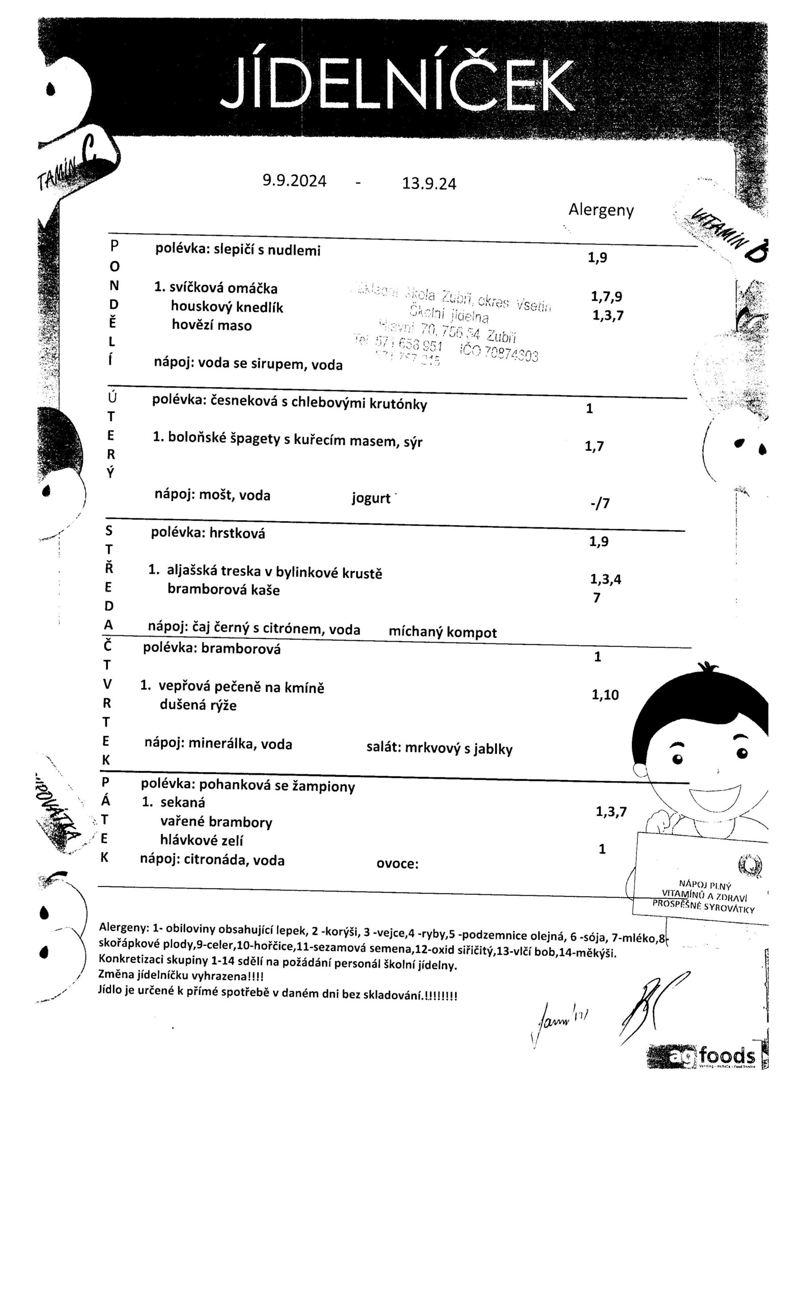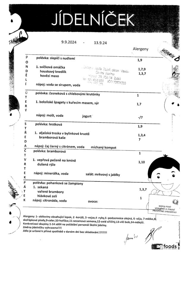 Jídelníček od 9.9.-13.9.2024