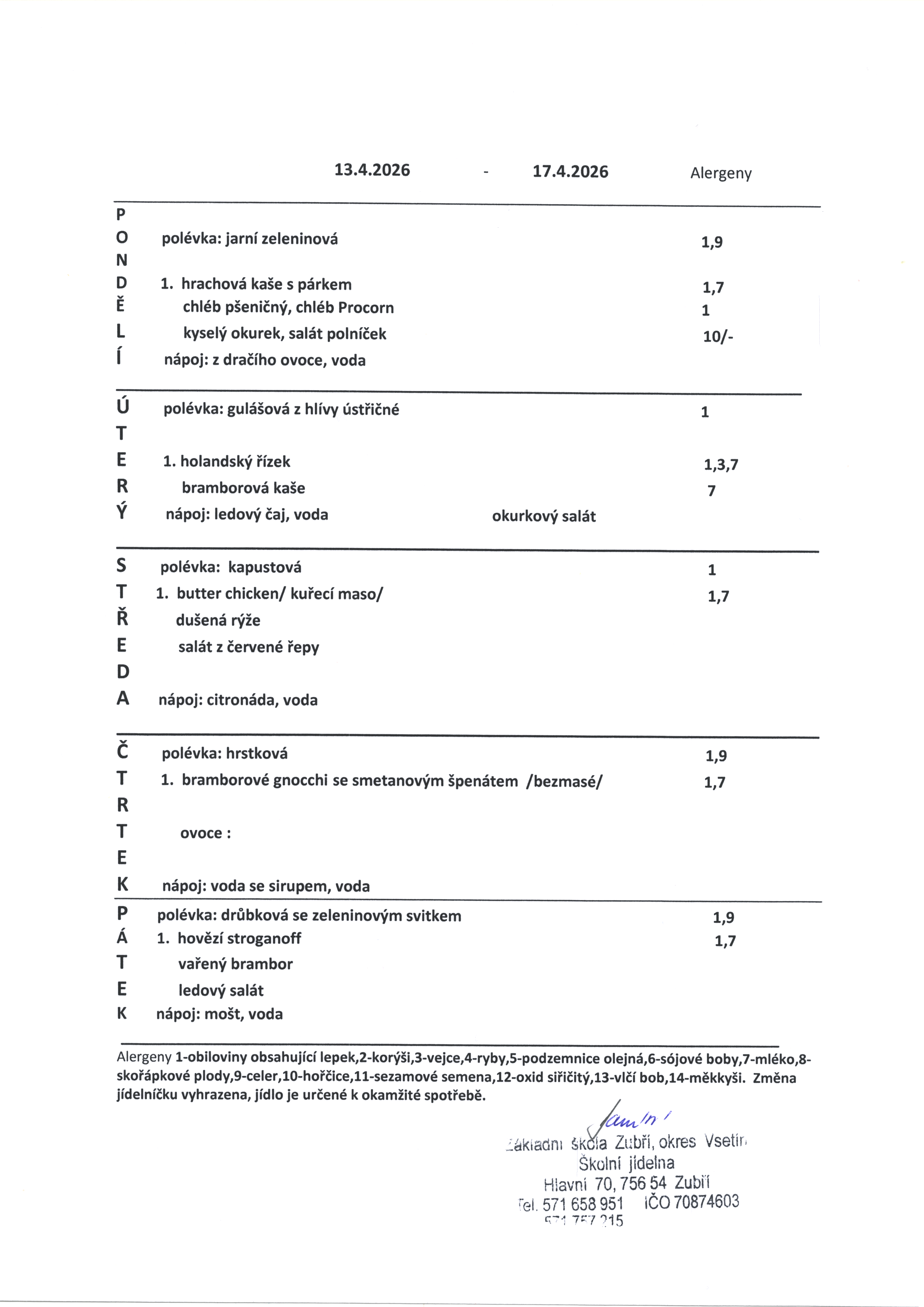 Jídelníček od 13.4.-17.4.2026