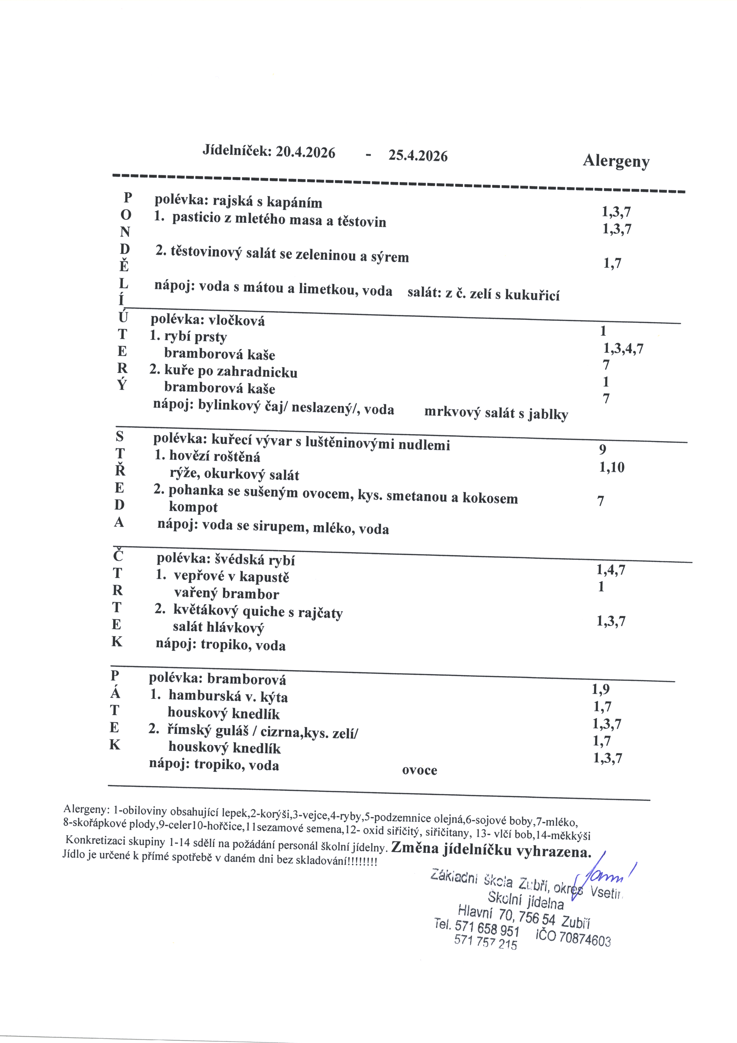 Jídelníček od 20.4.2026-24.4.2026